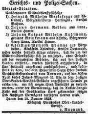 - Das Oberlandesgericht in Hamm befasst sich mit Desertierungsprozessen, wie eine entsprechende öffentliche Vorladung belegt, die am 28. Januar in der Beilage zum Rheinisch-Westfälischen Anzeiger abgedruckt wird.