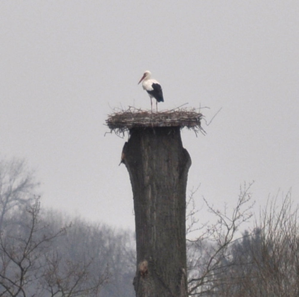 Das Storchenpaar hält sich viel am Nest auf. Das Weibchen sitzt oft auf dem Nest. Das Männchen sucht auf den umliegenden Wiesen Futter. Fotografiert am 01.04.2011 um 14 Uhr.