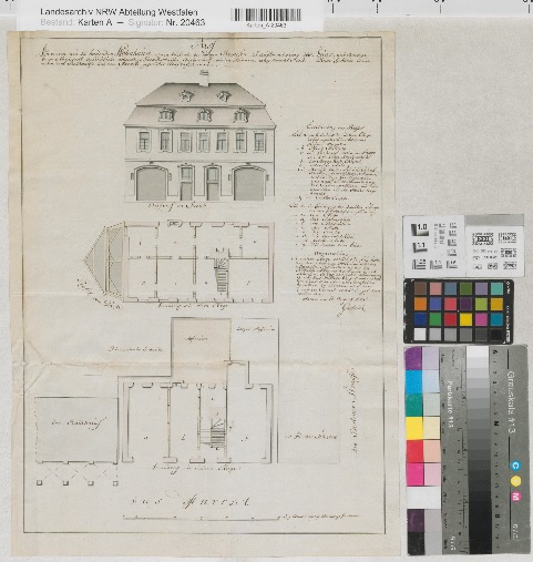 Hamm (Hamm) - Haus am Markt - (Entwurf) - Ansicht, Grundrisse - Riss von einem neu zu bauenden Wohnhause, worin zugleich die nötigen Remisen zu Aufbewahrung der Feuer und sonstigen beim Magistrat...