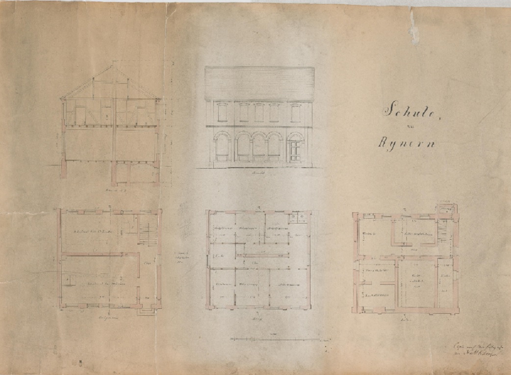 Rhynern (Hamm) - Schule - Grundrisse, Schnitt, Ansicht - um 1880 - 1 : 100 - 45 x 63 - kol. Zeichnung - Kopie nach dem Entwurf von Nattkämper - Bem.: alte Sign. Nr. 6243