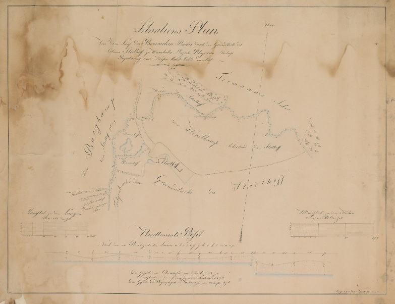 Wambeln (Hamm) - projektierte Mühle am Beverschen Bach mit Bachlauf durch die Grundstücke des Kolonen Sterthoff und Nivellement - 1818 - 50 Ruten = 7,6 cm - 20 Fuß = 7,5 - 39 x 57 - kol. Zeichnung - Gosebruch, Konduktor