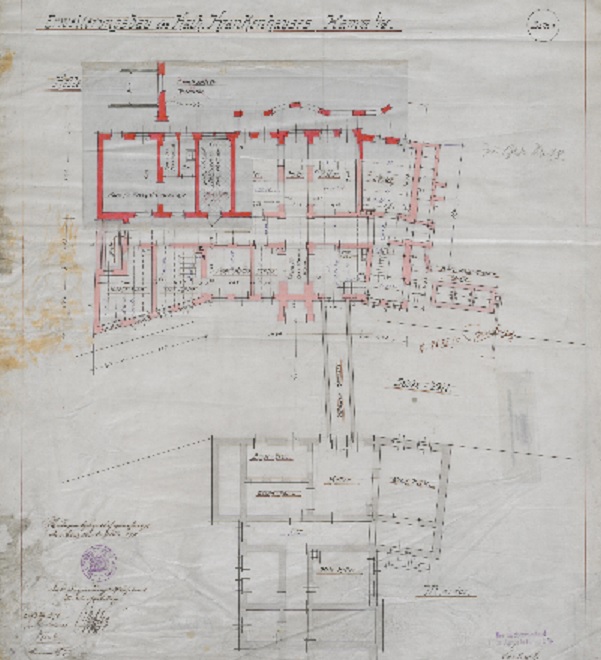 Hamm (Hamm) - Erweiterung des kath. Krankenhauses - Blatt 1 Grundriß Kellergeschoß - 1910 - 1 : 100 - 64 x 54 - Zeichnung - Brandt - KSA Nr. 1435,1