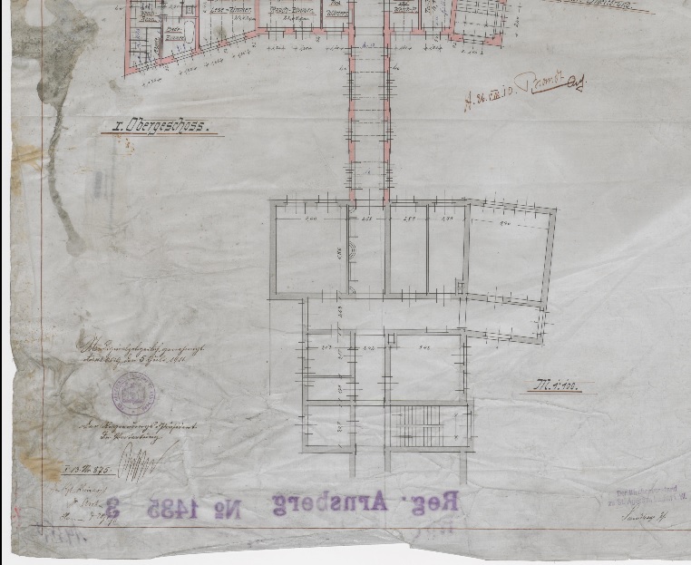 Hamm (Hamm) - Erweiterung des kath. Krankenhauses - Blatt 3 Grundriß 1. Obergeschoß - 1910 - 1 : 100 - 64 x 54 - Zeichnung - Brandt - KSA Nr. 1435,3