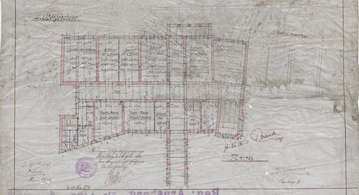 Hamm (Hamm) - Erweiterung des kath. Krankenhauses - Blatt 4 Grundriß Dachgeschoß - 1910 - 1 : 100 - 64 x 54 - Zeichnung - Brandt - KSA Nr. 1435,4