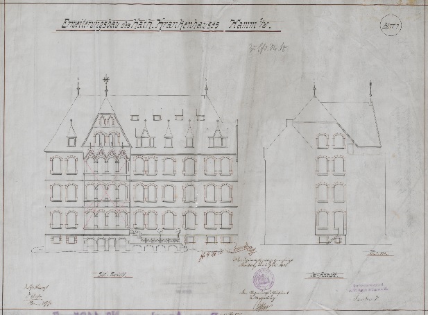 Hamm (Hamm) - Erweiterung des kath. Krankenhauses - Blatt 7 Süd- und Ostansicht - 1910 - 1 : 100 - 47 x 64 - Zeichnung - Brandt - KSA Nr. 1435,7