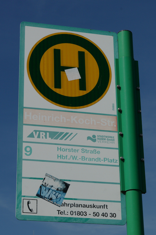 | aktuell | 09:12, 1. Mai 2011 | 533 × 800 (172 KB) | Bonni (Diskussion | Beiträge) | {{Bild-CC |Motiv=Haltestellenschild Heinrich-Koch-Straße |Fotograf=Frank-Th. Bonnemeyer |Aufnahmedatum=09.04.2011 |Quelle= |Urheber=Frank-Th. Bonnemeyer |Freigabe= }} Kategorie:Haltestellenschilder |