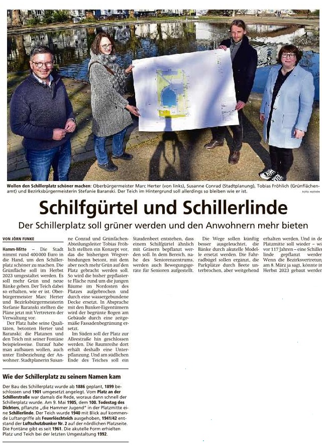 Jörn Funke: Schilfgürtel und Schillerlinde. Der Schillerplatz soll grüner werden und den Anwohnern mehr bieten. Westfälischer Anzeiger Hamm vom 05.03.2022