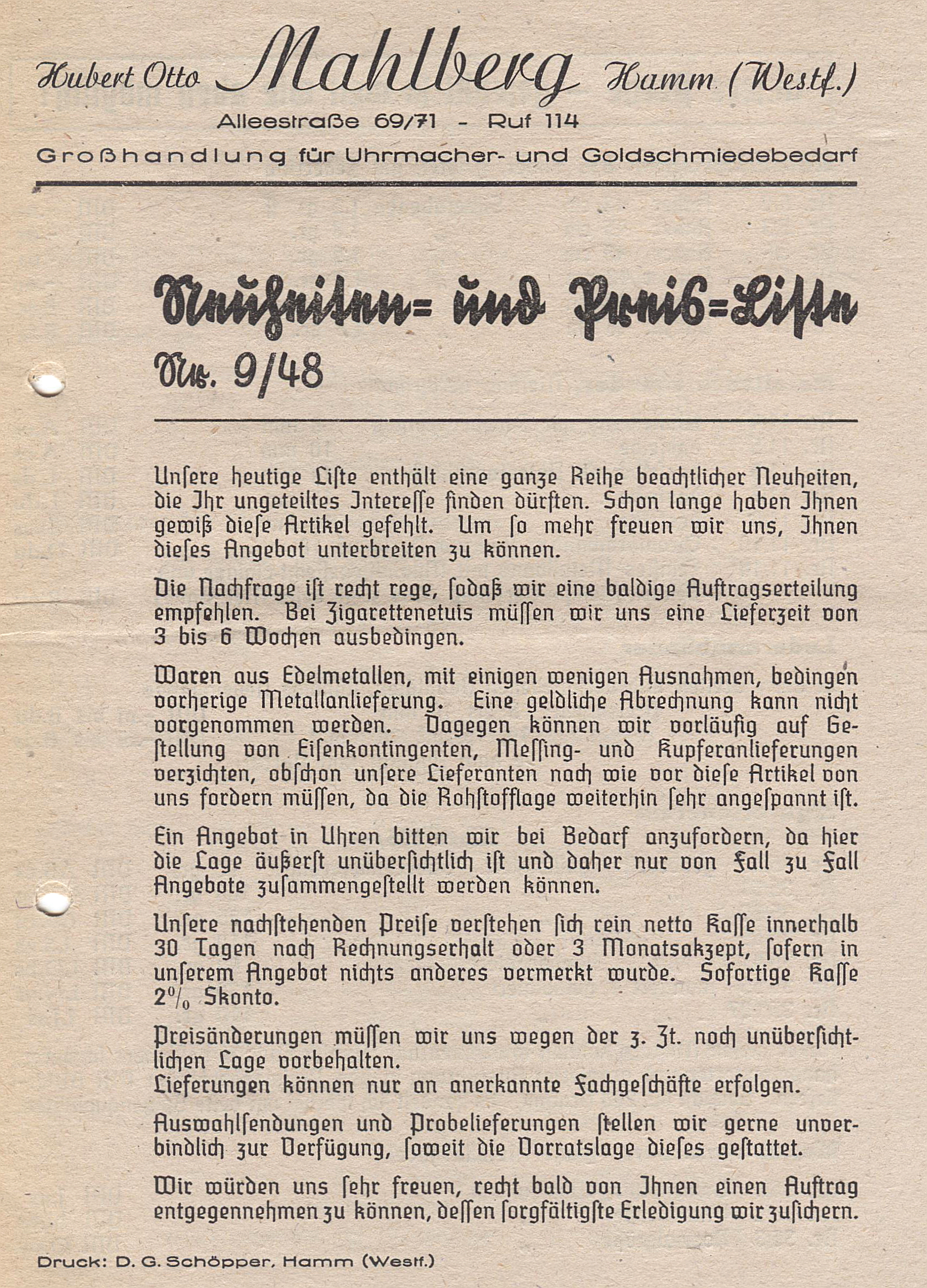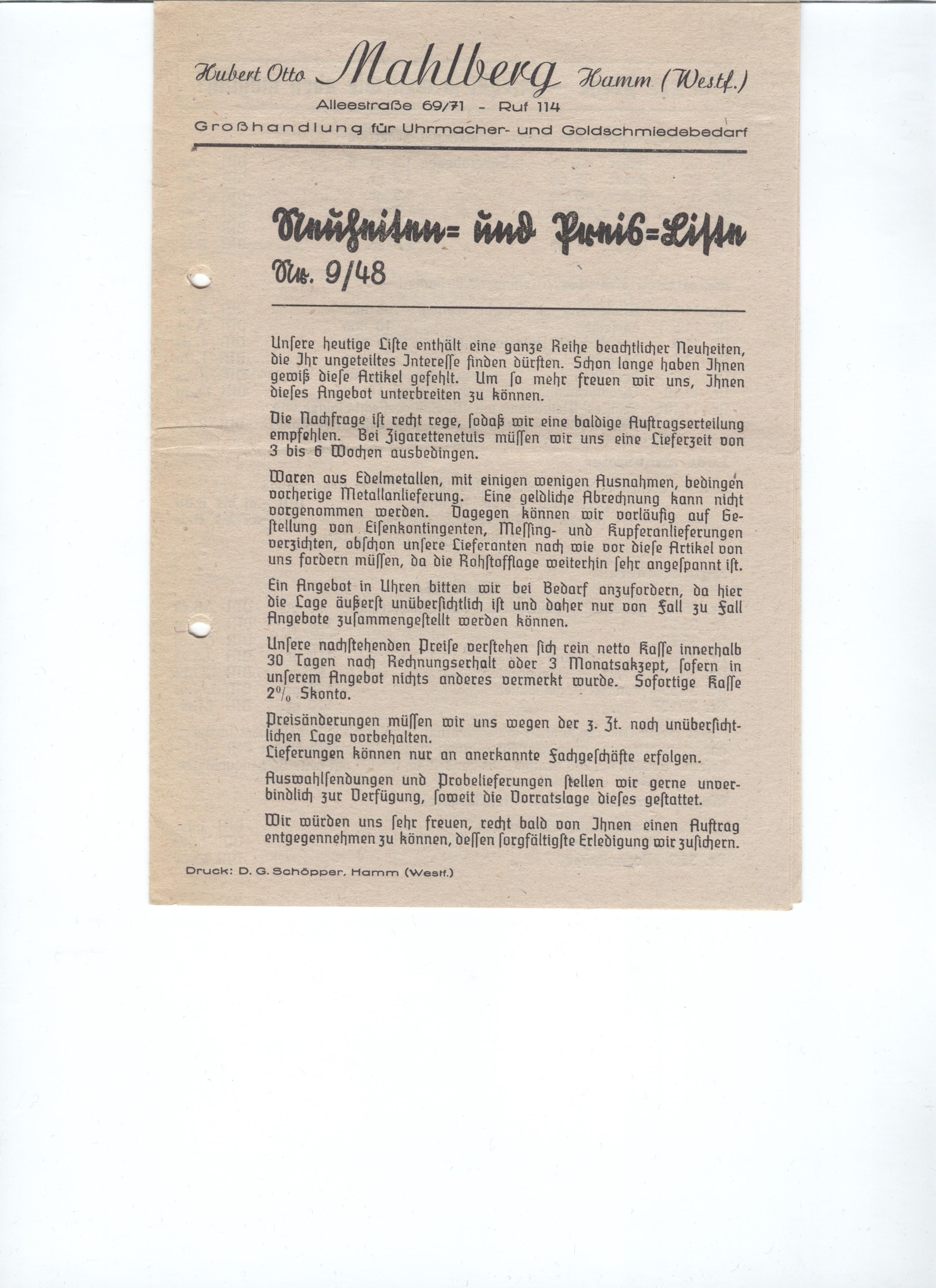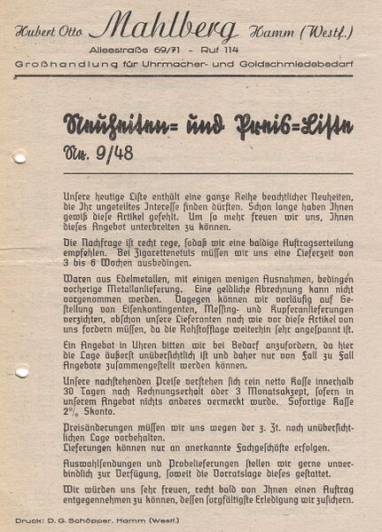 Erste Seite einer Preisliste der Hubert Otto Mahlberg Großhandlung für Uhrmacher- und Goldschmiedebedarf, Hamm, aus dem Jahr 1948 - Quelle: Archiv Dr. Detlef Berntzen