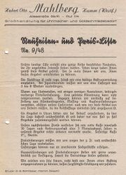 Preisliste der Fa. Hubert Otto Mahlberg aus dem jahr 1948